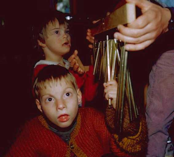 Steven ist jetzt 6 Jahre alt und wir sind wieder umgezogen. Diesmal nach Wildeshausen bei Bremen. Steven ist ein fröhliches Kind. Er fängt nur gelegentlich an zu weinen oder zeigt autoaggressive Neigungen, wenn er sich alleingelassen fühlt oder Blähungen hat. Er ist noch nicht sauber, doch es wird ein Toilettentraining (Toilettenstuhl) mit ihm durchgeführt. Beim Essen benötigt er Hilfestellung. Harte Lebensmittel, wie z.B.Apfelscheiben, Paprika, Nüsse u. a. bevorzugt er und kann diese alleine essen, wenn die Stücke nicht zu groß sind. Weiche Lebensmittel knetet und zermatscht er in seiner Hand, führt sie dann aber zum Mund und isst sie. Mit dem Löffel kann er nicht umgehen, aus der Schnabeltasse trinkt er gelegentlich allein, läßt sie aber leicht fallen. Steven kam weder krabbeln noch laufen. Er bewegt sich auf seinem Hintern rutschend fort, wobei er sich mit beiden Händen abstützt. Dabei nimmt er alles in den Mund, was in seine Reichweite kommt.